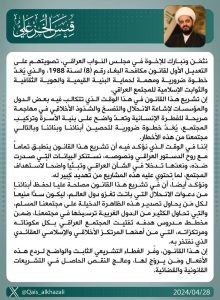 وتابع إننا “في الوقت الذي نؤكد فيه أن تشريع هذا القانون ينطبق تماماً مع روح الدستور العراقي ونصوصه نستنكر البيانات التي صدرت ضده، ونعدها تدخلا في الشأن العراقي وتبنيا واضحا لاستهداف المجتمع، لما تحتوي عليه هذه المشاريع من تهديد كبير له”.