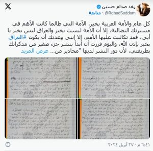 وأرفقت 40 صورة مع التدوينة، قائلة إنها “جزء بسيط جدًّا من مذكرات والدِي الرئيس”، مضيفة أن “الأمة التي طالما كانت الأهم في مسيرتك النضالية، إلا أن الأمة ليست بخير والعراق ليس بخير يا أبي، فقد تكالبت عليها الأمم”، على حد تعبيرها.