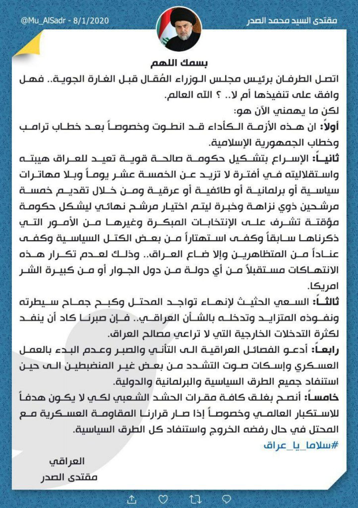 دعا زعيم التيار الصدري مقتدى الصدر اليوم الأربعاء، إلى غلق جميع مقرات الحشد الشعبي، جاء ذلك تعليقا على ما يجري من صراع امريكي ايراني.