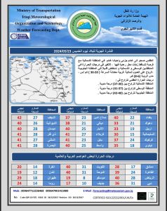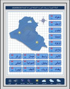 أعلنت هيئة الأنواء الجوية، اليوم الخميس ، حالة الطقس في البلاد للأيام المقبلة، فيما توقعت تساقط زخات مطر خفيفة في المناطق الشمالية مع تصاعد للغبار في مناطق أخرى يرافقها تذبذب في درجات الحرارة.