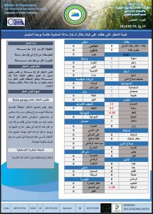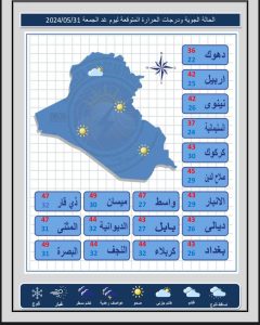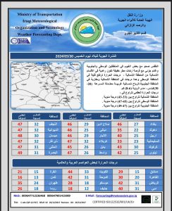 أعلنت الهيئة العامة للأنواء الجوية، اليوم الخميس ،، حالة الطقس في مدن البلاد، فيما توقعت ارتفاعا جديدا بدرجات الحرارة، مع فرص لسقوط زخات مطر رعدية وتصاعد للغبار في بعض المناطق.