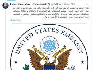 أدانت السفيرة الامريكية ألينا رومانوسكي، اليوم الخميس الهجمات العنيفة الأخيرة ضد الشركات الامريكية والدولية، محذرةً من إمكانية أن تضعف قدرة العراق على جذب الاستثمارات الأجنبية.