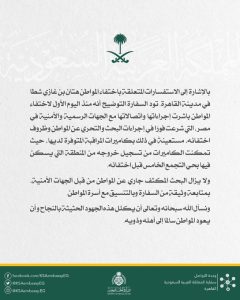 وقالت السفارة السعودية في بيان على منصة “إكس”، أن “السلطات المعنية شرعت فورا في اتخاذ إجراءات البحث والتحري عن المواطن وظروف اختفائه”.