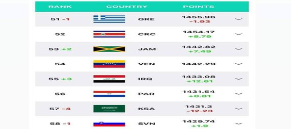 ارتقى منتخبنا الوطني بكرة القدم 3 مراتب في التصنيف الدولي بعد الفوز على فيتنام يوم امس 3-1 ، ليصل إلى المركز 55 ، فيما هبط المنتخب السعودي 4 مراتب ، ليصل الى المركز 57 بعد الخسارة امام الاردن 2-1 ضمن التصفيات المزدوجة لكاسي العالم واسيا “.