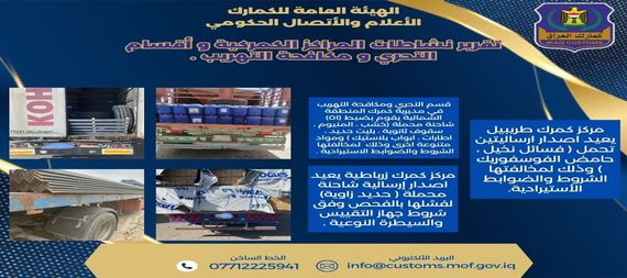 واضافت :” ان مركز كمرك زرباطية اعاد اصدار ارسالية شاحنة محملة بـ ( حديد زاوية) لفشلها بالفحص وفق شروط جهاز التقييس والسيطرة النوعية ، كما اعاد مركز كمرك طريبيل اصدار ارساليتين تحملان ( فسائل نخيل ، حامض الفوسفوريك ) وذلك لمخالفتهما الشروط والضوابط الاستيرادية.