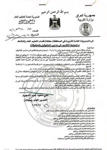 وبينت انه “لا يحق للطالب التقديم الى مدارس المتميزين وثانويات كلية بغداد ومدارس المتفوقين والمتفوقات في آن واحد وفي حالة حدوث ذلك يحرم الطالب من كلا التقديمين”، مبينة انه “يكون الاختبار وزاريا تحصيليا للمواد (اللغة العربية، اللغة الإنكليزية، الرياضيات، العلوم) من مواد الصف السادس الابتدائي”.