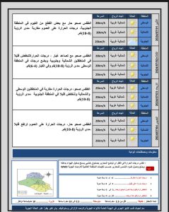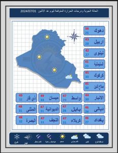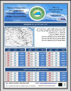 أعلنت هيئة الأنواء الجوية، اليوم الاحد ، حالة الطقس في البلاد للأيام المقبلة، فيما توقعت تذبذب درجات الحرارة مع تصاعد للغبار في مناطق متفرقة.