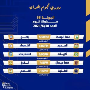 تشهد ملاعب اربع محافظات، اليوم الاحد ، انطلاق خمس مباريات ضمن الجولة الـ 36 لدوري نجوم العراق.