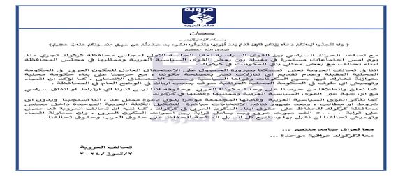 واضاف انطلاقا من حرصنا على وحدة مكوننا العربي وحقوقه اننا ليس لدينا اي ارتباط او اتفاق سياسي مع اي جهة غير القوى السياسية العربية وممثليها وقادتها في كركوك.