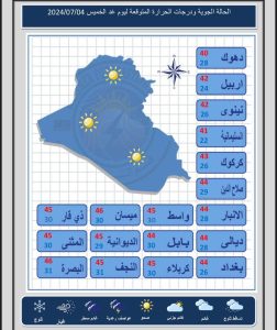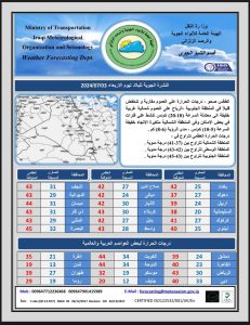 أعلنت هيئة الأنواء الجوية، اليوم الاربعاء ، حالة الطقس في البلاد للأيام المقبلة، فيما توقعت تذبذب درجات الحرارة مع تصاعد للغبار في مناطق متفرقة.