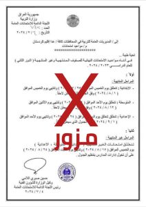 نوهت وزارة التربية، اليوم الخميس ، بشأن كتاب مزور انتشر على مواقع التواصل الاجتماعي فيه مواعيد الامتحانات للدور الثاني.