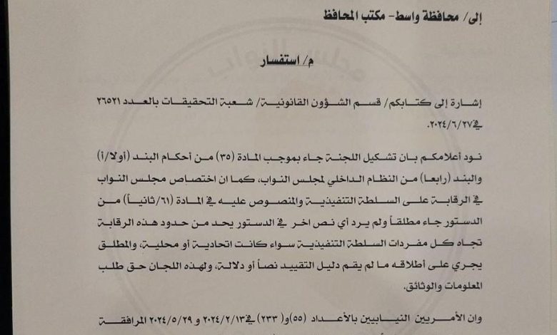 أوضحت رئاسة مجلس النواب، اليوم السبت، بشأن بطلان تشكيل لجنة مكافحة الفساد والاستغلال الوظيفي والمشكلة بطريقة غير قانونية من قبل النائب يوسف الكلابي عن محافظة واسط.وتضمنت اجابة مجلس النواب بعدم قانونية عمل تلك اللجنة وتعدي النائب صلاحياته التي رسمها له الدستور العراقي والنظام الداخلي لمجلس النواب وتحتفظ محافظة واسط بحق الرد القانوني جراء ذلك ومحاولة إرباك المشهد في عمل المحافظة ومجلسها.