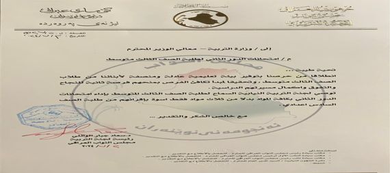 وقال نائب رئيس اللجنة محمود القيسي، في بيان :”سبق وأن وجهنا كتابًا يتضمن طلب السماح للراسبين في الصف الثالث المتوسط بإعادة الامتحان في الدور الثاني بجميع المواد التي رسب بها الطالب”.