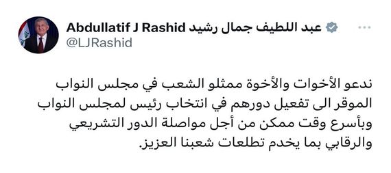 دعا رئيس الجمهورية الدكتور عبد اللطيف جمال رشيد إلى الإسراع في انتخاب رئيس لمجلس النواب.وقال رئيس الجمهورية في منشور على حسابه في موقع X: ندعو الأخوات والأخوة ممثلي الشعب في مجلس النواب الموقر الى تفعيل دورهم في انتخاب رئيس لمجلس النواب وبأسرع وقت ممكن من أجل مواصلة الدور التشريعي والرقابي بما يخدم تطلعات شعبنا العزيز.