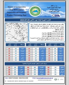 أعلنت هيئة الانواء الجوية، اليوم الاثنين ، عن حالة الطقس خلال الأيام المقبلة، فيما توقعت ارتفاعا طفيفا في درجات الحرارة في المنطقتين الوسطى والجنوبية مصحوبة بغبار خفيف.
