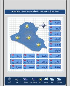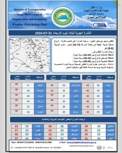 نشرت هيئة الانواء الجوية، اليوم الاربعاء ، توقعاتها لأجواء العراق خلال الأيام القادمة، فيما أكدت استمرار الطقس صحوا بدرجات حرارة مستقرة.