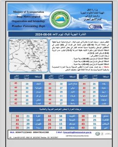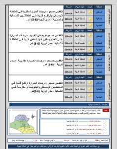اعلنت هيئة الانواء الجوية، اليوم الاحد ، عن حالة الطقس خلال الأيام المقبلة، فيما توقعت ارتفاعا جديدا بدرجات الحرارة مع أجواء صحوة.