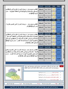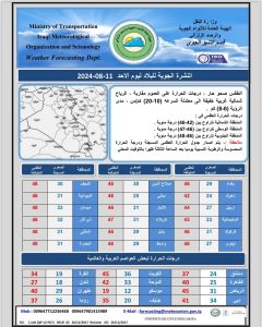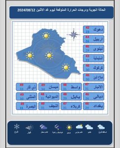 أعلنت هيئة الأنواء الجوية، اليوم الاحد ، عن حالة الطقس في مدن البلاد خلال الأيام المقبلة، فيما أشارت إلى أن الأجواء صحوة ودرجات الحرارة مستقرة وتقترب من الـ 50 مئوية خلال الأيام المقبلة.