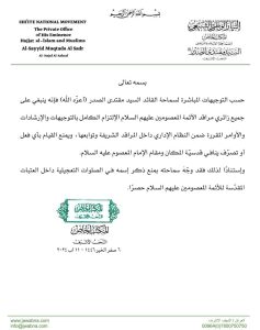 وبحسب وثيقة صادرة من مكتب الصدر، تلقتها “وطن نيوز”، انه “حسب توجيهات القائد مقتدى الصدر يُمنع جميع زائري مراقد الأئمة الأطهار حصرًا من ذكر اسمه في الصلوات التعجيلية”.