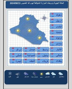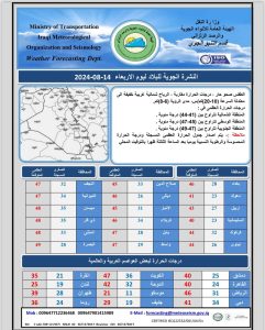 أعلنت هيئة الانواء الجوية، اليوم الاربعاء (14 آب 2024)، عن حالة الطقس خلال الأيام المقبلة، فيما توقعت تذبذبًا بدرجات الحرارة مع أجواء صحوة.
