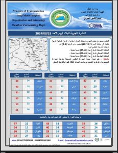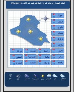 أعلنت هيئة الانواء الجوية، اليوم الاحد ، عن حالة الطقس خلال الأيام المقبلة، فيما توقعت درجات حرارة تتجاوز الـ50 مئوية في بعض المناطق.