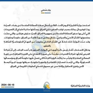 وقالت الوزارة في بيان تلقته “وطن نيوز”، إنها “استدعت القائم بأعمال سفارة المملكة المتحدة لدى بغداد روث كوفيردال وسلمتها مذكرة احتجاج على تصريحات سفير المملكة لدى جمهورية العراق ستيفن هيتشن التي مست بمضمونها الشأن الأمني والسياسي العراقي”.