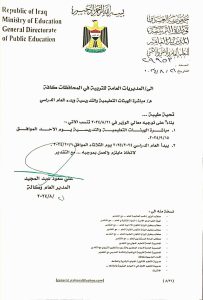 وتابعت: “فيما سيكون الخامس عشر من شهر أيلول المقبل موعدا لمباشرة الهيئات التعليمية والتدريسية في البلاد عدا إقليم كردستان بغية الاستعداد والتحضير الأمثل لامتحانات الدور الثاني للمراحل غير المنتهية”.