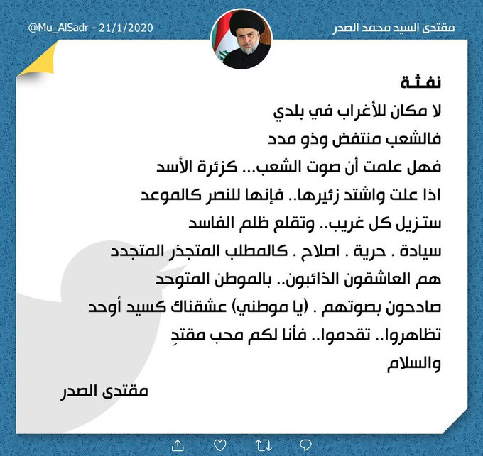 نوه عضو مجلس النواب باسم خشان والذي هو مرشح عن ائتلاف سائرون، الى وجود خطأ املائي في تغريدة زعيم التيار الصدري مقتدى الصدر الاخيرة على “تويتر”.
