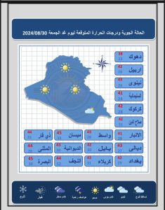 أعلنت هيئة الانواء الجوية، اليوم الخميس ، عن حالة الطقس في مدن العراق خلال الأيام المقبلة، فيما توقعت أجواء صحوة مع انخفاض ملحوظ بدرجات الحرارة.