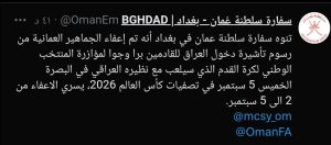 وقالت السفارة العمانية في تغريدة نشرتها على حسابها الرسمي بمنصّة “إكس” وتابعتها “وطن نيوز”: تنوه سفارة سلطنة عمان في بغداد أنه تم إعفاء الجماهير العمانية من رسوم تأشيرة دخول العراق للقادمين براً وجواً لمؤازرة المنتخب الوطني لكرة القدم الذي سيلعب مع نظيره العراقي في البصرة الخميس 5 سبتمبر في تصفيات كأس العالم 2026، يسري الإعفاء من 2 إلى 5 سبتمبر .