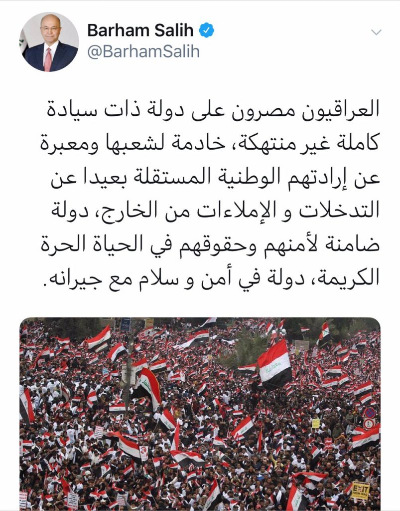أكد رئيس الجمهورية برهم صالح اليوم الجمعة، على ضرورة ان يكون العراق دولة ذات سيادة كاملة غير منتهكة.