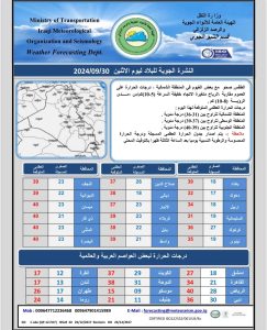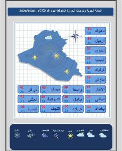 أعلنت هيئة الانواء الجوية، اليوم الاثنين ، عن حالة الطقس في العراق خلال الأيام المقبلة، فيما توقعت تساقط الامطار بالمنطقة الشمالية مع تذبذب بدرجات الحرارة بين ارتفاع وانخفاض بأغلب المناطق.