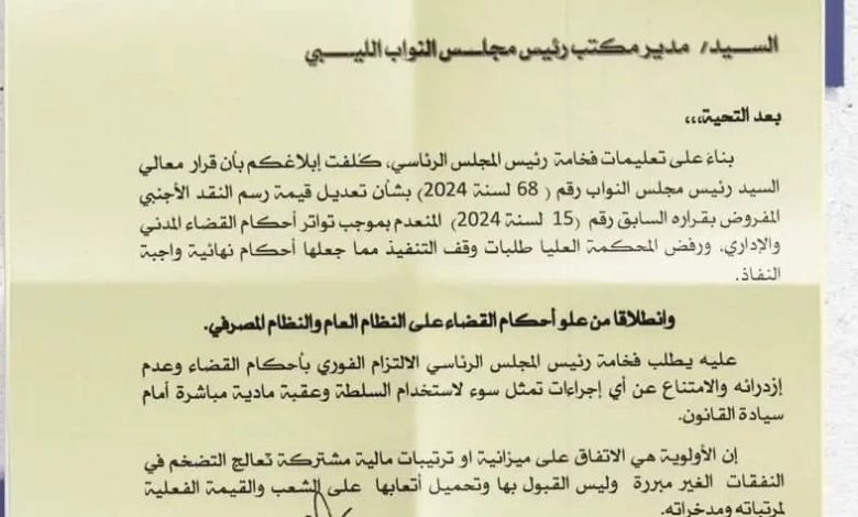 وجدت القيادة الجديدة للمصرف المركزي في ليبيا، نفسها في موقف محرج لتنفيذ القرارات المتباينة بين القادة الليبيين في شرق البلاد وغربها، بشأن فرض ضريبة على سعر العملات الأجنبية.وكان البرلمان أصدر قرارا بخفض قيمة الرسم المفروض على سعر العملات الأجنبية بنسبة 7% بعد أن قرر مطلع مارس 2024 الماضي فرض ضريبة بقيمة 27% إبان فترة المحافظ السابق الصديق الكبير، وبدأ المصرف المركزي العمل بهذا القرار، لكن هذه الخطوة رفضها المجلس الرئاسي وحكومة الوحدة الوطنية، اللذان يطالبان بتنفيذ أحكام القضاء وإلغاء هذه الضريبة نهائيا. وفي رسالة وجهّها لرئيس البرلمان عقيلة صالح، طالب رئيس المجلس الرئاسي محمد المنفي، بضرورة الالتزام بأحكام القضاء وعدم ازدرائه والامتناع عن أي إجراءات تمثل سوء استخدام السلطة وعقبة مادية مباشرة أمام سيادة القانون. وشدّد المنفي على أن الأولوية الآن هي الاتفاق على ميزانية أو ترتيبات مالية مشتركة تعالج تضخم النفقات غير المبرر، وعدم تحميل أتعابها على الشعب والقيمة الفعلية لمرتباته ومدخراته.وفي وقت سابق، طالب رئيس حكومة الوحدة الوطنية عبد الحميد الدبيبة، في مراسلة وجهّها إلى محافظ المصرف المركزي الجديد ناجي عيسى، بعدم تنفيذ قرار البرلمان بخفض ضريبة بيع النقد الأجنبي إلى 20%، داعيا إلى إلغائها بالكامل.