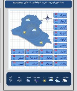 أعلنت هيئة الأنواء الجوية العراقية، اليوم الاحد ، عن تفاصيل حالة الطقس في البلاد للأيام المقبلة، فيما اشارت إلى تأثر البلاد بمرتفع جوي يتمركز شرق أوروبا مسببا أجواء خريفية، بالإضافة إلى فرص لسقوط الأمطار الرعدية وتراكم السحب في الأجواء الشمالية والجنوبية والوسطى.