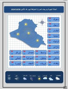 أعلنت هيئة الانواء الجوية والرصد الزلزالي، اليوم الاحد ، حالة الطقس للأيام المقبلة، فيما توقعت ان تشهد اجواء البلاد غيوما مع فرصة لنزول أمطار.