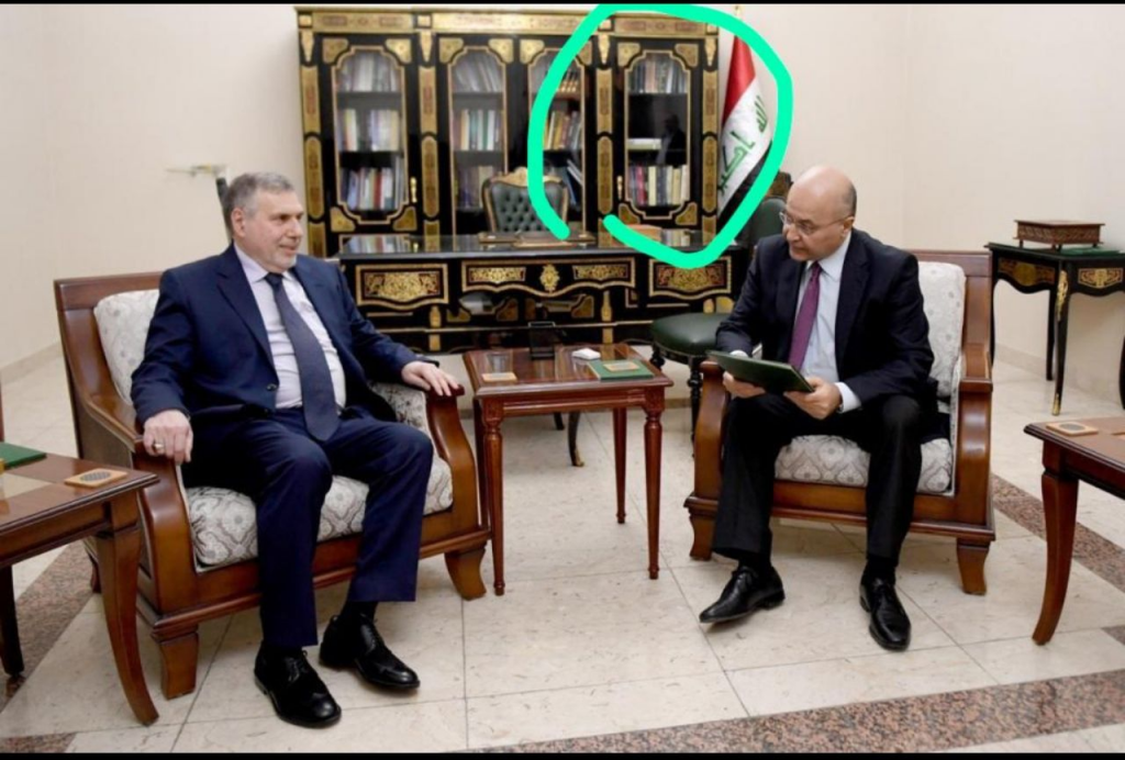 وما اثار الانتباه في الصور المنتشرة وهي تعكس الفرحة المرسومة على تعابير علاوي وهو يكلف بشكل رسمي بالمنصب التنفيذي الاول في البلاد وهو جالس مع برهم صالح، الغريب باللقاء وما عكسته المرأة الموجودة خلفهم والتي اظهرت وجود ابو جهاد الهاشمي مدير مكتب عبد المهدي المستقيل.