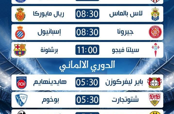 جدول مباريات الدوريات الكبرى لهذا اليوم