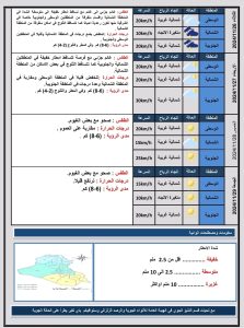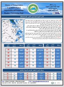 أعلنت هيئة الأنواء الجوية، اليوم الاثنين ، عن تفاصيل حالة الطقس في العراق للأيام المقبلة، فيما توقعت حالة من عدم الاستقرار في عموم البلاد نتيجة منخفض جوي مصحوب بكتلة هوائية باردة، والطقس بين الصحو إلى غائم جزئيا، مع فرصة لتساقط الأمطار في الجنوب والثلوج بشكل خفيف ومتقطع من المناطق الشمالية.