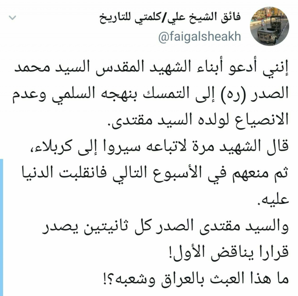 وجه عضو مجلس النواب فائق الشيخ علي تساؤلا لاتباع الصدر قائلا “ما هذا العبث بالعراق؟”.