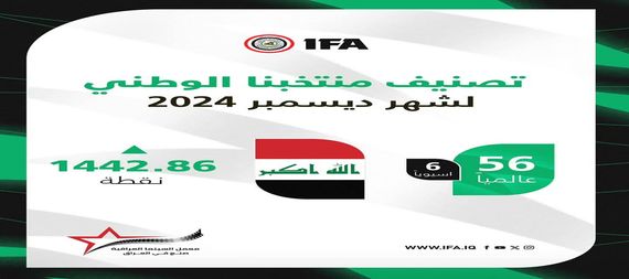 حافظ منتخبنا الوطنيّ على المركز “56” في قائمةِ التَصنيفِ الشهريّ التي أصدرها الاتحادُ الدوليّ لكرةِ القدم FIFA لشهر كانون الأول/ ديسمبر الحالي.ووفقاً للتصنيفِ الذي صدرَ، فقد استقر المنتخبُ الوطنيّ في المركزِ السادس على المُستوى القاريّ بمجموع 1442.86 نقطة.وجاءَ منتخبنا الوطنيّ بعدَ منتخباتِ اليابان وإيران وكوريا الجنوبية وأستراليا وقطر في قائمةِ التصنيف على مُستوى القارةِ الآسيويّة.