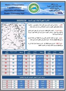 أعلنت هيئة الانواء الجوية، اليوم السبت عن حالة الطقس في البلاد، مؤكدة ان الأجواء ستكون صافية مع ارتفاع طفيف بدرجات الحرارة.
