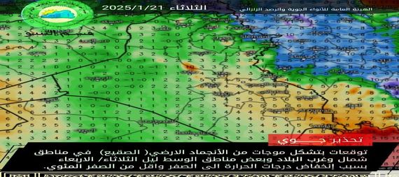 حذر المتنبئ الجوي صادق عطية ، من تشكل موجات من الانجماد الأرضي فجر وصباح الأربعاء في شمال وغرب البلاد بسبب إنخفاض درجات الحرارة. من الصفر وأقل من الصفر المئوي.