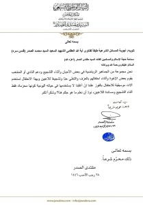 أكد زعيم التيار الوطني الشيعي مقتدى الصدر، اليوم الخميس، أن الاحتفال بالتغني والعزف أثناء تشجيع المنتخب ودعم النادي “محرم شرعاً”.