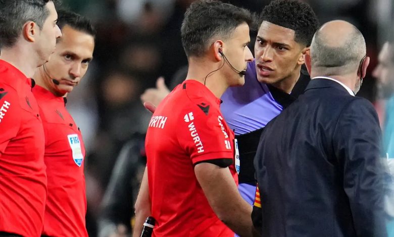 كشف تقرير صحفي إسباني، يوم الأحد، عن حدود العقوبة المحتمل توقيعها على الإنجليزي جود بيلينجهام، بعد طره في تعادل ريال مدريد وأوساسونا (1-1)، أمس السبت، على ملعب إل سادار، ضمن الجولة 24 من الليجا.وطرد بيلينجهام ببطاقة حمراء مباشرة في الدقيقة 39، بدعوى “تلفظه بكلمة بذيئة تجاه حكم اللقاء مونويرا مونتيرو”، لينتظر بالتالي قرار لجنة الانضباط التي ستحسم أمر العقوبة الموقعة عليه، الأربعاء المقبل.وبحسب صحيفة “موندو ديبورتيفو”، فوفقًا لتقرير الحكم، بات بيلينجهام مهدد بالإيقاف لمباراتين على الأقل وشهر على الأكثر، بسبب “ازدراء أو عدم احترام الحكم”.