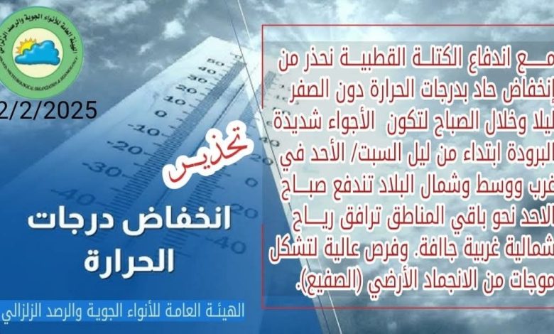 حذرت هيئة الانواء الجوية، اليوم السبت ، من اندفاع كتلة قطبية نحو البلاد، متوقعة إنخفاضا حادا بدرجات الحرارة تهبط الى دون الصفر، فيما ستصل موجات الانجماد الأرضي الى” الصقيع” في مناطق متفرقة