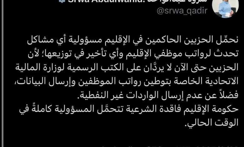 حملت النائب سروة عبدالواحد ،اليوم السبت، الحزبين الحاكمين مسؤولية تأخر صرف رواتب موظفي الاقليم بحسب تغريدة لها عبر منصة “x”.