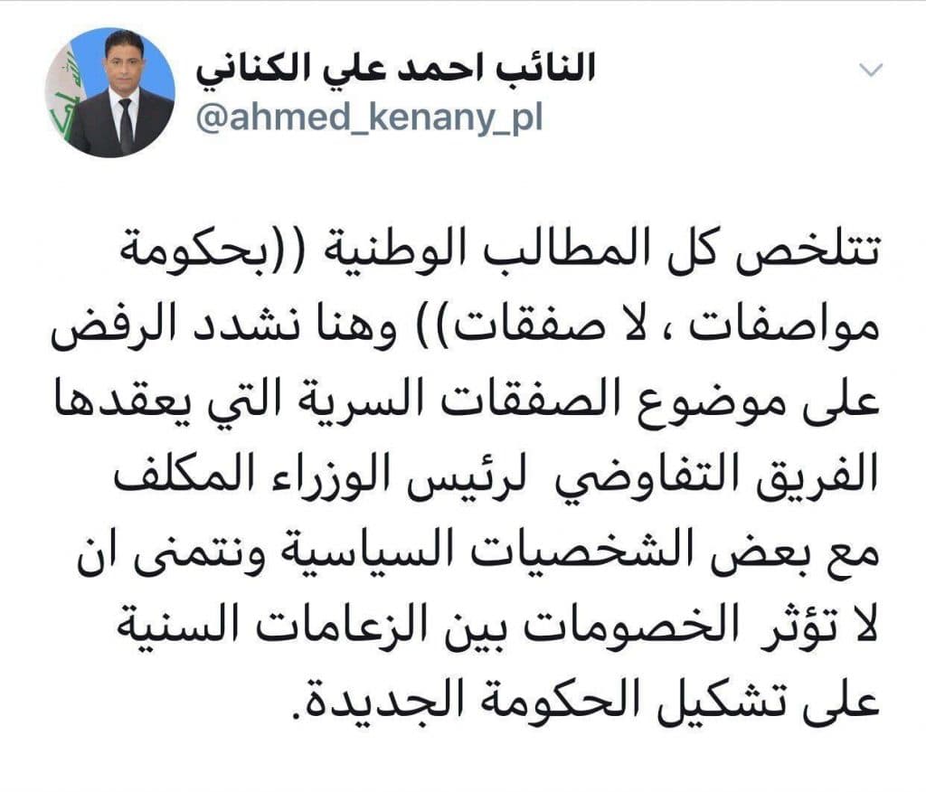 اشار عضو مجلس النواب احمد الكناني اليوم الاربعاء ،في تغريدة له على موقع “تويتر” الى وجود صفقات سرية يعقدها فريق رئيس الوزراء المكلف محمد توفيق علاوي مع بعض الشخصيات السياسية.