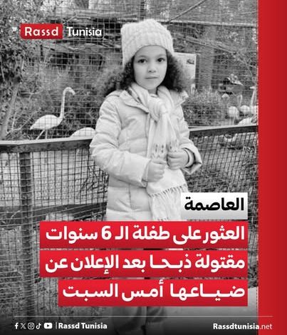 عثرت الجهات الأمنية في تونس على جثة طفلة تحمل آثار اعتداء بآلة حادة بعد إبلاغ أهلها باختفائها السبت الماضي، وفق ما أفادت إذاعة “موزاييك إف إم”. وفي التفاصيل التي أفادت بها “موزاييك إف إم” تعهد قاضي التحقيق بالمحكمة الابتدائية في تونس بالبحث في ملابسات وفاة طفلة زينب الطرخاني البالغة نحو 6 أعوام، بجهة العمران الأعلى (إحدى ضواحي العاصمة تونس).ووفق المعطيات الأولية المتوفرة فإن عائلة الطفلة أعلموا عن غيابها منذ إفطار أول أمس السبت في ظروف وملابسات مجهولة. وحسب المعطيات فقد تمكنت الوحدات الأمنية أمس الأحد من العثور على جثة الطفلة زينب الطرخاني ليتم إعلام ممثل النيابة العمومية الذي توجه إلى المكان رفقة قاضي التحقيق وتم إجراء المعاينات الأولية التي بينت وجود آثار عنف واعتداء على جسد الطفلة التي يشتبه في تعرضها للاعتداء بواسطة آلة حادة.وفتح القضاء التونسي بالمنطقة تحقيقا في الحادثة مع الاحتفاظ بشخص يقطن غير بعيد عن منزل عائلة الطفلة، على ذمة التحقيق.ونشرت صفحات محلية تونسية صورة الطفلة ومعلومات أولية تقول إن الطفلة “رافقت شخصا مختلا عقليا كانت تلعب معه في كثير من الأحيان و تم العثور عليها في سطح منزله مقتولة”.
