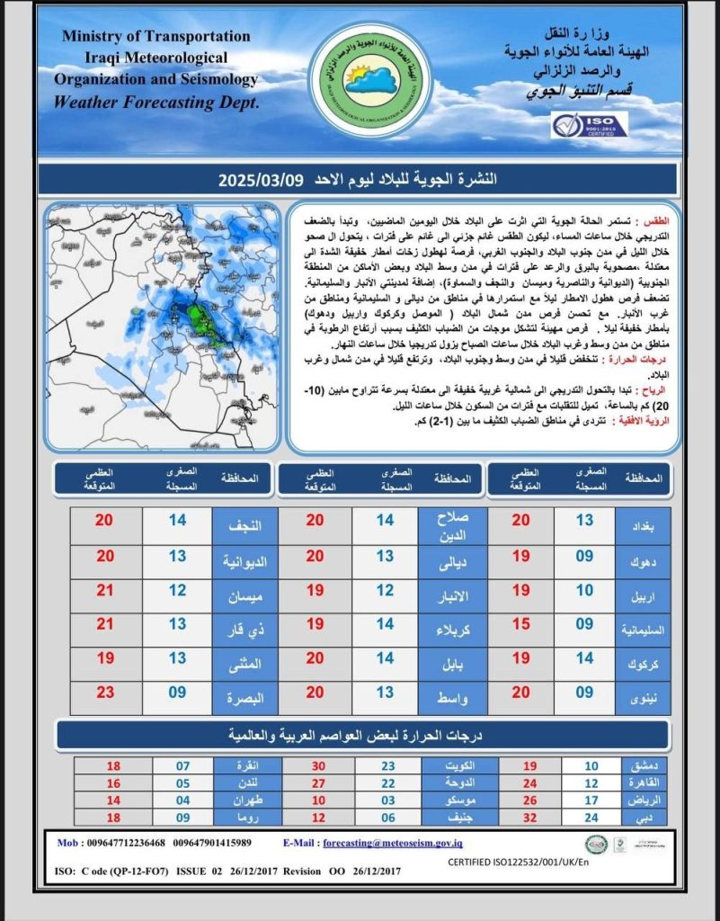 وأشارت الهيئة إلى أن “الفرصة ما زالت مهيأة لهطول زخات من الأمطار تتراوح شدتها بين الخفيفة والمعتدلة، مصحوبة بالبرق والرعد في بعض مناطق وسط البلاد وجنوبها، ومن بينها الديوانية، الناصرية، ميسان، النجف، السماوة، إضافة إلى الأنبار والسليمانية”.