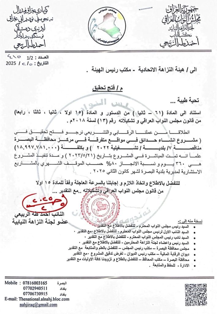 الرئيسية/اخبـار العراق/لا وجود لها على ارض الواقع.. النزاهة النيابية تحقق بمشروع انشاء حدائق في البصرة بقيمة ١٩ مليار دينار اخبـار العراق لا وجود لها على ارض الواقع.. النزاهة النيابية تحقق بمشروع انشاء حدائق في البصرة بقيمة ١٩ مليار دينار 2025-03-10 34 2025-03-10 34 شاركها فيسبوك X لينكدإن Tumblr بينتيريست Reddit VKontakte Odnoklassniki Pocket مشاركة عبر البريد طباعة